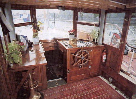 Scott Beadle took charge of the machinery and Graham Parker of the electrics. Her two Perkins diesels were entirely overhauled and a 10KVA 240-volt generator was added to supply the domestic equipment and charge her over-size batteries. The latest radio and navigation equipment were installed in the mahogany panelled wheelhouse, alongside the old brass compass and wooden wheel. Every handhold and window catch, every light fitting, hatch and porthole is in period and in impeccable taste. The floor throughout is covered in Persian rugs. When Bluebird was first built, it took Thornycroft’s 55 days. Her restoration in 1984 took a whole year and cost fifty times as much but then, when men of vision fall in love, they rarely count the cost!