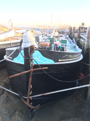 Tollesbury is a fishing village in Essex, on a tributary of the river Blackwater, which was a loading port for the stack barges. They could lie alongside for horse drawn wagons to unload them. It was after this village that the barge Tollesbury was named by Mr. Fisher, her owner in 1901. She was built at Feltham's Yard at Sandwich on the Kentish Stour. It was this as much as her squat profile that earned her the name Sandwich Box. In 1912 she joined the fleet of R & W Paul Ltd., the most famous wharfingers in East Anglia, who traded in grain, malt and animal feeds and, to perfect their fleet, became barge builders themselves. The skipper of the Tollesbury was Lemon Webb who earned his keep - and the Tollesbury by carrying stone from the West Country, as well as coal, coke and pitch from both sides of the Channel during the First World War.